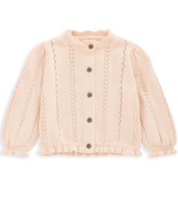 Knitted Cardigan – PinkThe perfect coming home collection, this beautiful range of timeless quality newborn clothing is designed to nurture your little one.Long-sleeved knitted pointelle cardigan, with scallop neckline. Frilled cuffs and trim. Wood button fastening.